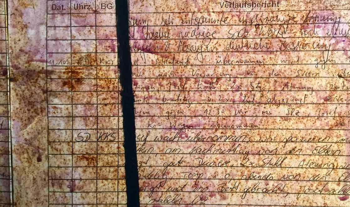 Wir gehen den Gang entlang. Dann links. Josef schläft noch. Herzfrequenz 122. Sauerstoffsättigung 97. Ich streichele seine Wange. An seiner Hand hat er den Sensor vom Monitor. Er leuchtet rot. Seine Leuchtehand.