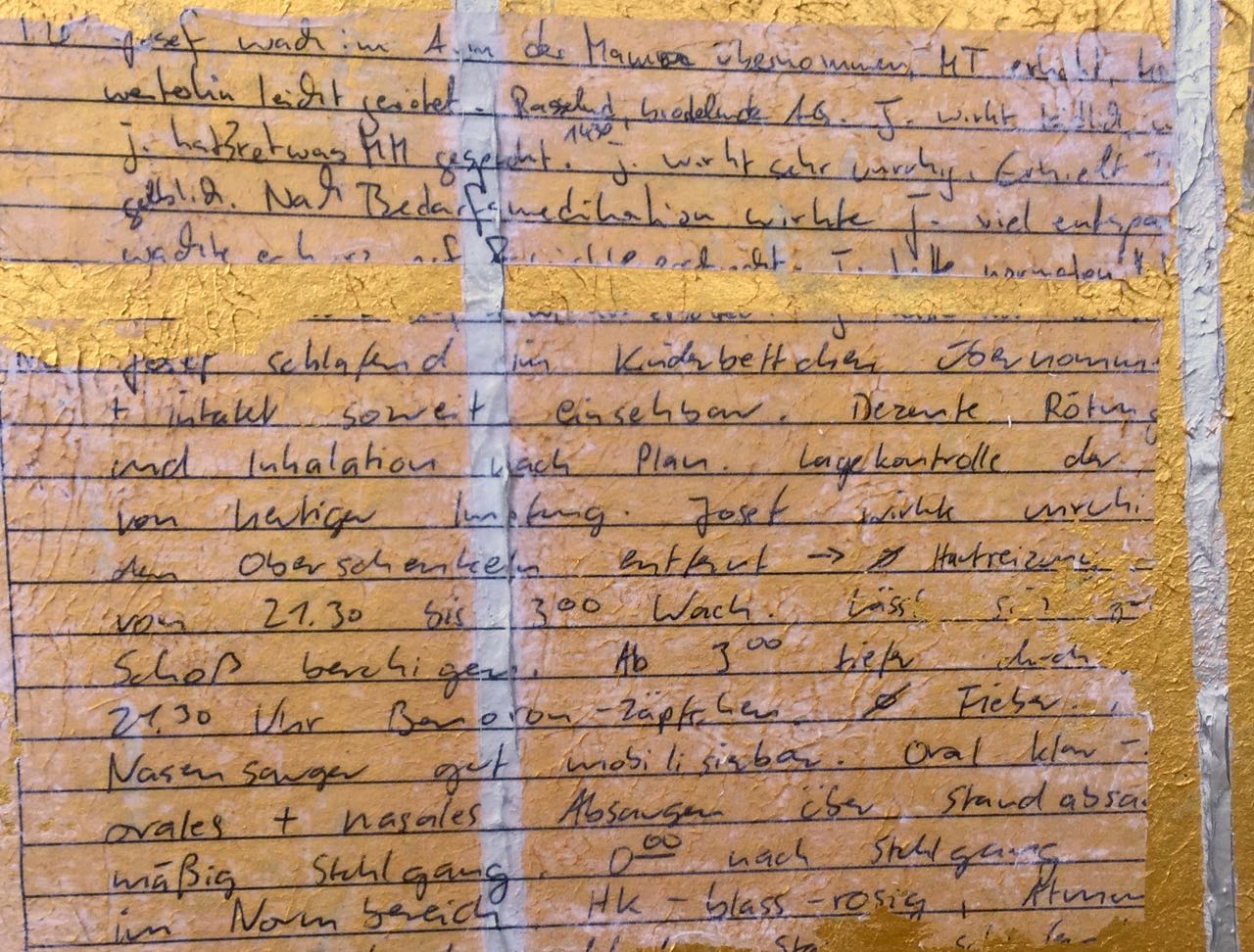Ich frage, wie die Nacht war. Unruhig war die Nacht. Viel geschlafen hat er nicht. Gegen 5.00 hat Josef geweint. Er hat ein Ben-u-ron bekommen. Jetzt döst er langsam wieder ein. Gut.