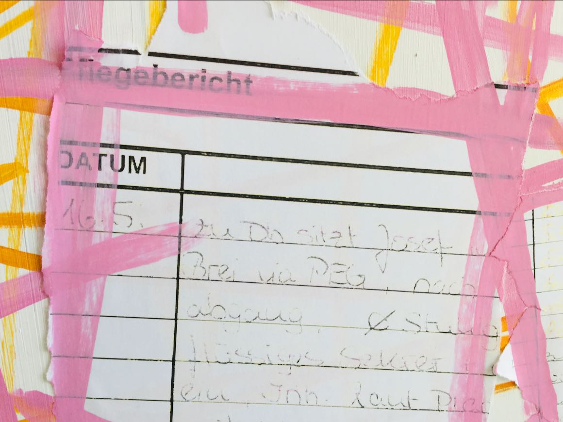 Ich frage nach der Nacht. Josef schlief bis 5.00 Uhr durch. Ab und zu hatte Josef Sauerstoffsättigungsabfälle. Sekretbedingt, sagt er. Vitalwerte waren im Normbereich. Kein Fieber. Keine sichtbaren Krämpfe. Das Sekret ist klar. Gut, sage ich. Gut. Fühle mich sicher. Ich küsse Josef. Nehme ihn in den Arm.