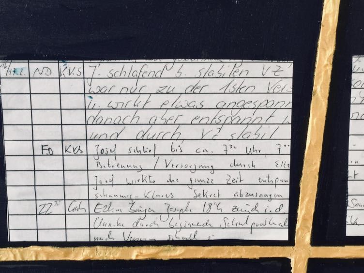 Wir gehen nach Hause. Dann gemeinsam ins Kinderhospiz. Eine Schwester vom Pflegedienst ist da. Sie wird Nachtdienste bei Josef machen. Sie ist ruhig. Freundlich. Bei Josef. Mit ihren Fragen. Das ist schön. Josef ist entspannt.