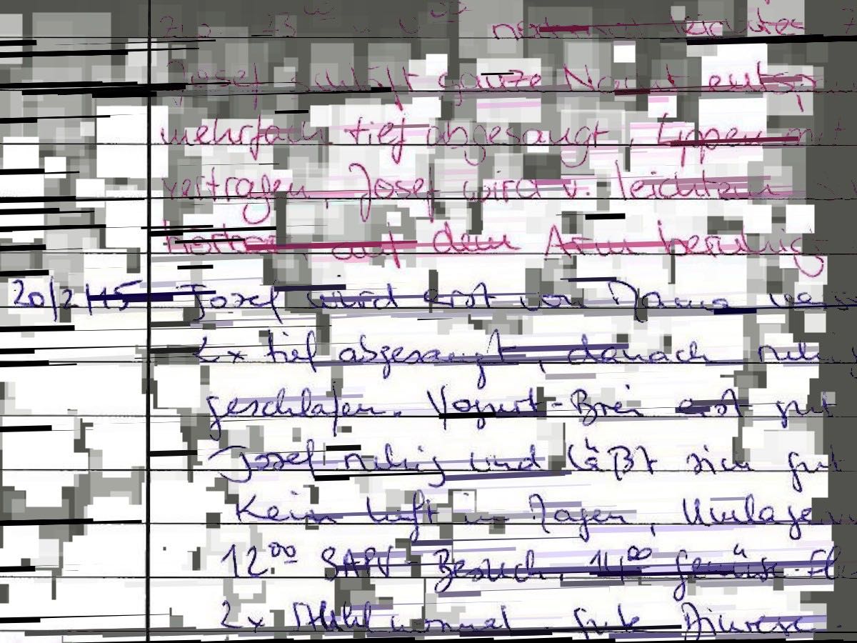Um 8.00 Uhr klingelt es. Die Schwester. Ich ziehe Josef vorsichtig um. Sage ihr, die PEG ist in Ordnung. Reizlos. Lässt sich bewegen. Gut, sagt sie. Gut. Ich erkläre ihr. Sage, es ist nicht so, dass ich es dir nicht zutraue, Josef umzuziehen. Es ist so, dass es für mich etwas ganz Besonderes ist. Meinen Josef umzuziehen. Es ist ein ganz intimer Moment. Mein Kind umzuziehen. Deshalb, sage ich.