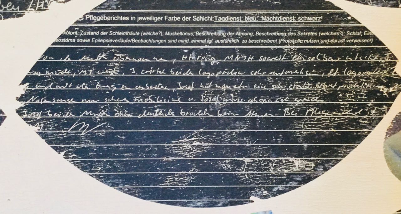 Uli ist aufgestanden und in der Küche bei Klara. Ich bin bei Josef. Klara geht in die Schule. Uli winkt ihr nach. Bis er sie nicht mehr sieht. Uli verwandelt das Schlafzimmer in ein Arbeitszimmer. Ich bin bei Josef. Inhaliere ihn. Er wird langsam wach. Seine Atmung wird schwer. Er atmet gegen das viele Sekret an.
