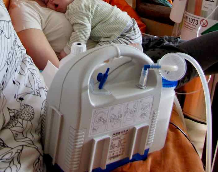 Das Telefon klingelt. Der Sauerstoffmann. In einer halben Stunde ist er da. Gut, wir auch. Um 12.30 Uhr klingelt es. Der Sauerstoffmann. Er hieft die Sauerstofftonne mit der Sackkarre die Treppe hinunter. Unten höre ich es zischen. Die Tonne wird gefüllt.